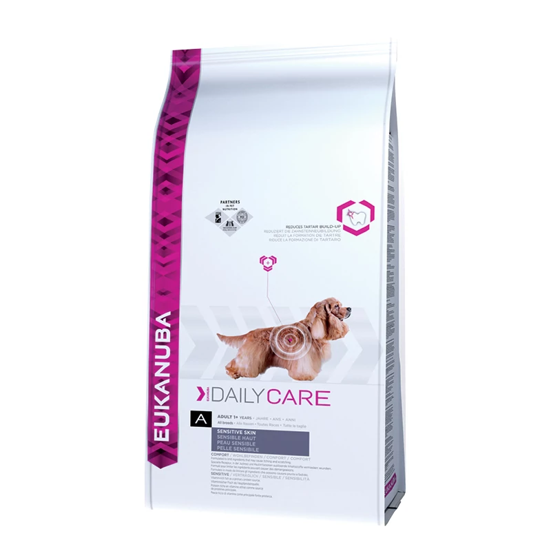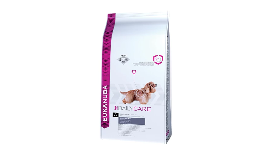 Az Eukanuba Adult Daily Care Sensitive Skin száraz kutyatápot speciálisan az érzékeny bőrű, 1 év feletti felnőtt kutyák szükségletei szerint fejlesztették ki. Speciális receptúrája maximális jó közérzetre törekszik, ennek jegyében kerüli a viszketést és bőrirritációt kiváltó összetevőket. Fő fehérjeforrása a vitaminokban gazdag hal, ami könnyű emészthetőséget garantál, s elősegíti, hogy kutyája izomzata erős és sovány legyen. A fehérjék, zsírok, szénhidrátok, fontos vitaminok és ásványi anyagok speciálisan egymáshoz igazított részaránya ideális tápanyagellátást biztosít. Az ideális tápanyag-felszívódásról és a harmonikus emésztésről prebiotikumok és szárított cukorrépa-apríték gondoskodik, kedvezve a kiegyensúlyozott bélflóra meglétének.