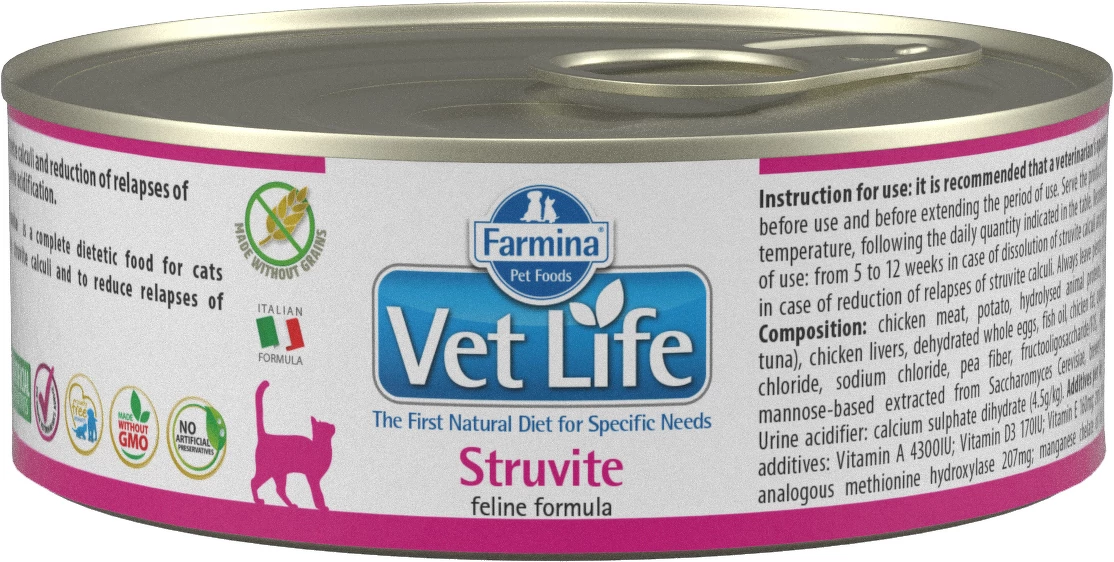 A struvit húgykövek feloldására és kiújulásának megelőzésére, vizeletsavasításra szolgáló eledel. Farmina Vet Life Struvite diétás eledel macskák számára a struvit húgykövek feloldására és kiújulásának megelőzésére kifejlesztve. Használati útmutató: Ajánlott állatorvos véleményének kikérése használat vagy az etetés meghosszabbítása előtt. A terméket szobahőmérsékleten tálaljuk, követve a napi mennyiség táblázatban előírtakat.